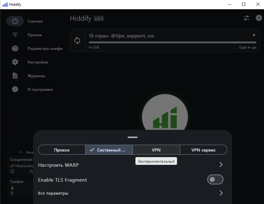 По умолчанию в приложении выставлен режим «Системный». Перейдите в «Параметры конфигурации» -> «Режим работы» -> Выберите «VPN (экспериментальный)». Перезапустите Hiddify от имени администратора и проверьте работу Discord.