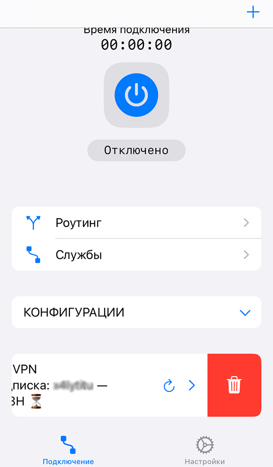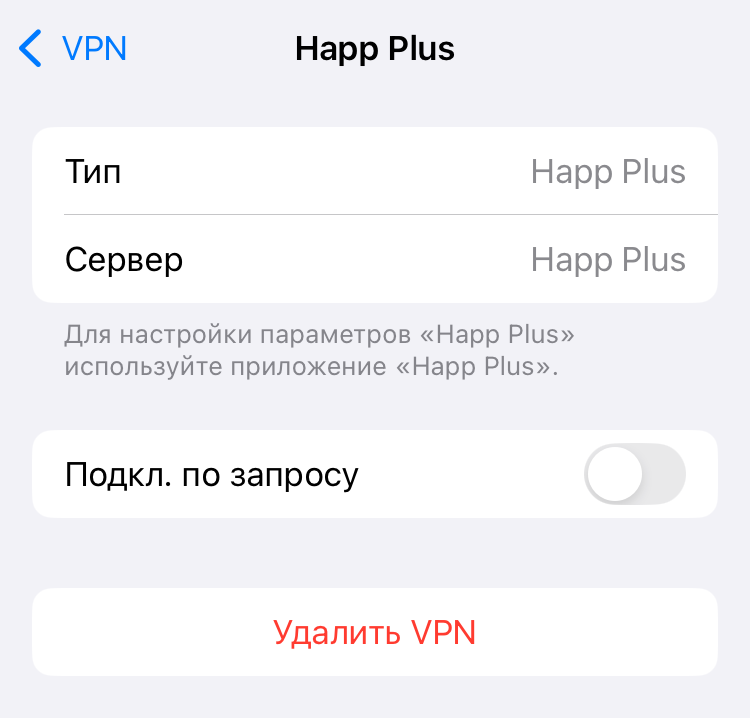 3. Удалите конфигурацию VPN в настройках iPhone: «Настройки» -> «VPN». Нажмите иконку «i» напротив нужного приложения и кнопку «Удалить». Добавьте новую конфигурацию по этой инструкции