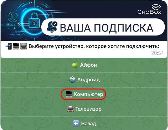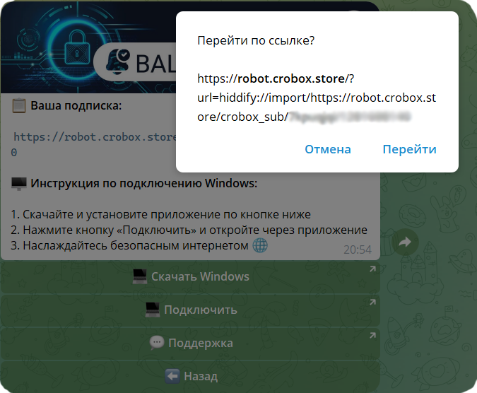 Установка ключа VPN в автоматическом режиме через меню нашего бота работает только при установке приложения Hiddify